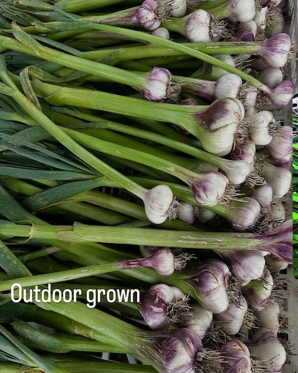 Garlic Check for readiness to harvest, not by tops yellowing, but by feeling under surface level whether there is a swelling of cloves, whatever size the bulb is. We are three weeks ahead of schedule here, because of the weather. Many softneck are ready now or soon, while hardneck are usually two to three weeks later.