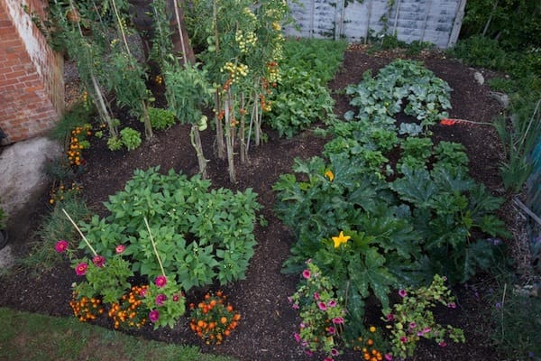 Watering is every 3-4 days with a hose. The 25 m² / 270 ft.²‘small garden’ has cropped 62 kg / 136 lb this year.The far end needs extra water because of neighbouring trees rooting under the fence. Far left is a new vertical garden, see next photo.
